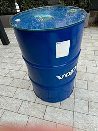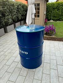 Il tavolino è costituito da un barile d’olio con una copertura in vetro. Il barile è vuoto, ma presenta qualche traccia d’olio all’interno. Altezza tavolino 90 cm, diametro della superficie 60 cm.