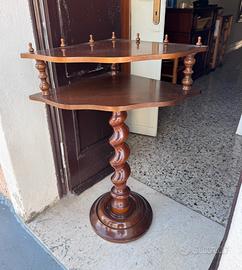 Vendo elegante tavolino angolare in legno, dal design classico con gambo tornito e due ripiani sagomati.