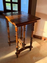 Vendo tavolino d’epoca in legno, con piano quadrato e gambe tornite, completo di traversa centrale che lo rende stabile e solido.