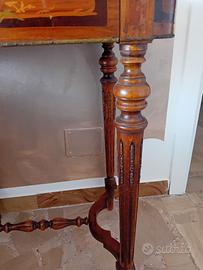 Tavolino da salotto/comodino di fine gusto, in stile Luigi XV/XVI, realizzato in legno lastronato con raffinati intarsi floreali policromi sul piano e sul fronte.