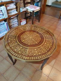Tavolino antico finemente intarsiato con lavorazione tipica di Sorrento, diametro cm 89, altezza cm 48