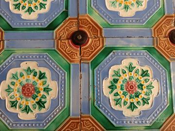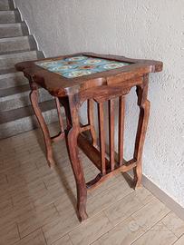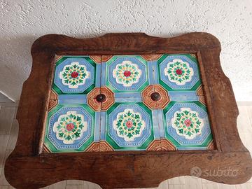 Tavolino art Nouveau con maiolica antica Wankaner, origine India ( Gujarat ) epoca 1920 e struttura in noce. Misure del piano 61 cm x 46 cm Altezza cm 71