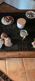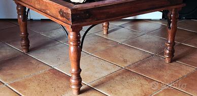Tavolino Arte povera acquistato nel 1998, con inserti stampi per stoffa sul piano. SENZA VETRO.