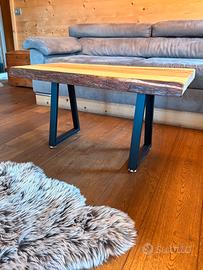 Tavolino artigianale per interno realizzato in legno di quercia massello stagionato naturalmente 8 anni. Il piano è stato levigato e trattato con una finitura trasparente protettiva che mette in risalto le venature naturali del legno e aiuta a proteggerlo da macchie e graffi.