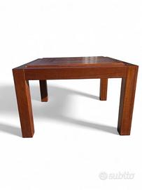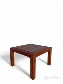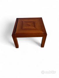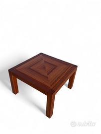 Tavolino quadrato da salotto in legno, con piano a intarsio geometrico a quattro spicchi e giunzioni a 45° sui bordi. Tavolino di Iroko Massello