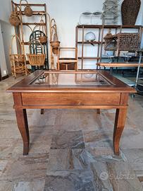 Tavolo basso da salotto con vetro che si solleva. Buone condizioni generali con qualche segno dell'età e di utilizzo.