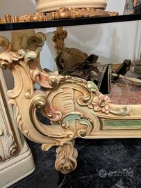 Vendo splendido tavolino in stile barocco/rococò, riccamente intagliato e decorato, con piano superiore in vetro nero e struttura in legno massello policromo con finiture dorate e dettagli verde pastello.