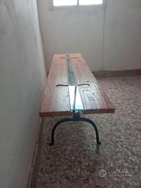 Vendo tavolino basso artigianale, con tavole in ciliegio e piede realizzato con un antico cavalletto in ferro(trispa). Misure: Altezza 40 cm Profondità 32 cm Lunghezza 144 cm