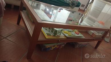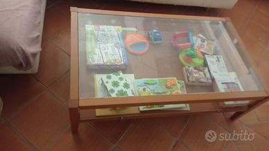 Tavolino basso moderno da salotto in vetro e legno con cassetto contenitore estraibile da entrambi i lati. Misure 120 X 70