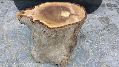 Tavolino basso in vetro scuro e pesante, 75 cm x 75 cm x 1 cm di spessore, alto 25 cm, con base di tronco in noce.