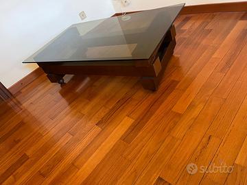 Tavolino basso vetro e legno porta TV o altro, in perfetto stato. Vetro fumé, legno marrone scuro. Vendo solo per ritiro