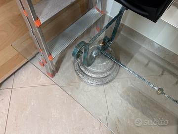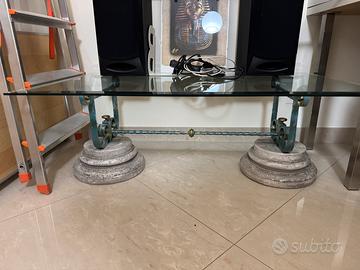 In vendita bellissimo tavolino basso da salotto con design particolare e di grande impatto! • Piano in vetro temperato trasparente spesso (120 cm di lunghezza × 70 cm di profondità). • Altezza totale: 42 cm (ideale come coffee table davanti al divano). • Struttura composta da due grandi basi decorative in cemento grezzo con effetto pietra antica (forma a gradini tipo capitello classico, molto pesanti e stabili). • Elemento centrale in ferro battuto verde anticato con barra ritorta e dettagli in ottone. • Stile eclettico che unisce elementi industriali, classici e moderni. Dà carattere al soggiorno! Condizioni: buono stato di usato. Il vetro è in ottime condizioni (pulito e senza graffi evidenti). Le basi in cemento hanno il tipico aspetto “vissuto” e anticato del materiale (piccole macchie naturali, non difetti). Il ferro ha patina d’epoca ma è solido e stabile. Nessun danno strutturale. Pezzo unico, non di produzione in serie. Molto scenografico e pesante (le basi in cemento lo rendono stabile, non traballa). Dimensioni: 120 cm (L) × 70 cm (P) × 42 cm (H) Perfetto per chi cerca un tavolino diverso dal solito, con personalità forte. Prezzo trattabile – pronta consegna. Scrivimi per info o altre foto! Solo ritiro a mano