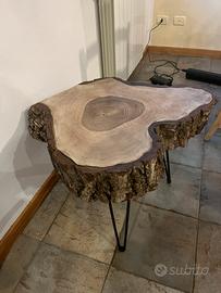 Tavolo in noce con corteccia, con gambe in metallo con finitura trasparente