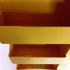 Boby è il carrello contenitore che ha fatto storia del design. Iconico nel suo colore giallo. Disegnato da Joe Colombo e prodotto da Bieffeplast negli anni '70 è realizzato in plastica ABS. E' dotato di tre cassetti apribili e di diversi ripiani, in quello inferiore è presente la firma del designer. Nel complesso si presenta in ottimo stato. Nello scomparto inferiore la plastica sembra rovinata, come se fosse stata esposta al calore. Nel ripiano inferiore vi rimasta un'etichetta che pensiamo possa essere tolta con del vapore.