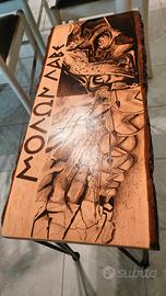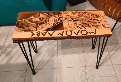 Tavolino in legno di ontano rosso artigianale, effetto vetrificato. Pirografato a mano scena film 300 spartans. Piedini in ferro con gommino antiscivolo. Finitura con vetrificatore che protegge da graffi e usura totalmente idrorepellente...
