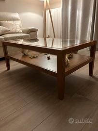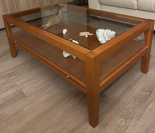 Tavolino d’arredamento per salotto in vetro e legno massello. Misure 59 larghezza x 99 lunghezza