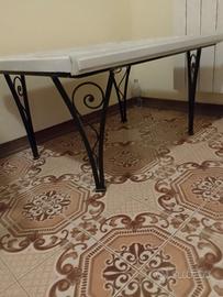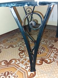 vendo tavolino da salotto e non,..con base in ferro battuto fatto artigianalmente su disegno; La base del tavolino è realizzato con lastre di pietra lavica ceramizzata e decorata,incastonate su una testata di lettino di più di 50 anni fa' . sono presenti delle fenditure dovute alla delicatezza della pietra .Ma cmq il prezzo è relativo alla base in ferro battuto,diciamo che il piano si può sostituire con qualunque altro piano