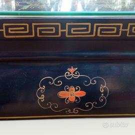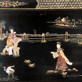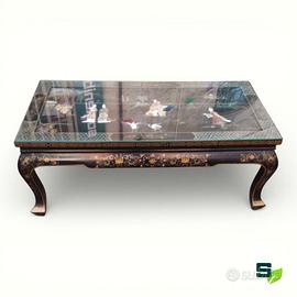 Tavolino da centro orientale cinese realizzato in legno laccato nero, rifinito con decori a rilievo in pietre dure e madreperla e dipinti a mano.