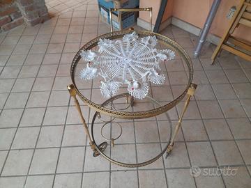 Ottimo tavolino circolare con porta bottiglie, in ottone,con ruote.