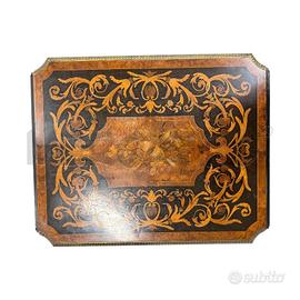 TAVOLINO INTARSIATO CON ALI NAPOLEONE 3. IN LEGNO CON PROFILI IN OTTONE LAVORATO. DIMENSIONO DI 113X56 CENTIMETRI (ALI APERTE). ALTEZZA 75 CENTIMETRI. OTTIME CONDIZIONI.
