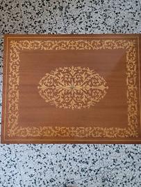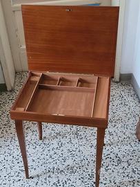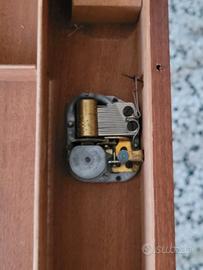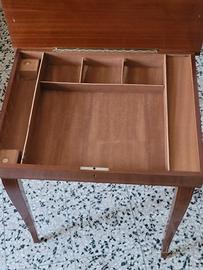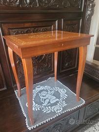 Piccolo tavolino in legno con piano intarsiato apribile sotto il quale è presente il vano portagioie/oggetti suddiviso in vari scomparti. All'apertura entra in funzione un carillon con melodia " Sul mare luccica (santa Lucia)" di Caruso. In ottime condizioni per gli anni che ha. Misura 45x36x50. Ritiro a cura dell'acquirente presso il mio domicilio. Non effettuo spedizioni. Articolo raro.
