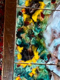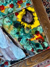 Altezza: 42cm Larghezza: 77cm Lunghezza: 112cm Per ulteriori foto contattatemi. Tavolino basso a pianta quadrata con struttura in legno massello e cornice perimetrale leggermente rialzata, caratterizzato da un piano composto da piastrelle ceramiche smaltate disposte a griglia e decorate a mano con un soggetto figurativo continuo raffigurante un musicista tra motivi floreali; la superficie risulta lucida e materica, resistente e adatta a un uso sia funzionale che ornamentale.