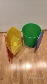 Tavolino con sedia per bimbi. Altezza 54cm Larghezza 77cm Profondità 55,5 cm. Il tavolino e la sedia presentano diversi graffi (come evidenziato nelle foto) ma sono ancora robusti. Aggiungo volendo in omaggio due contenitori porta giochi.