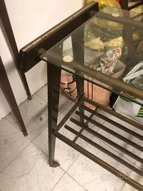 tVENDO –Tavolino di buone dimensioni, utilizzabile come supporto TV, console o carrello da servizio. Design della metà del secolo scorso, con struttura in legno laccato marrone scuro e bordi che si raccordano a gambe rovesciate a "V" o ad "A". Piano in vetro trasparente, ruote multidirezionali originali.