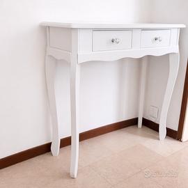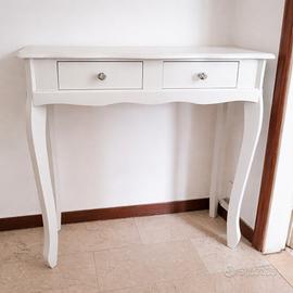 Tavolino / console in legno bianco con 2 cassetti – Ottime condizioni Dimensioni: lunghezza -77cm Profondità -30cm Altezza -80 cm Descrizione Vendo tavolino/console in legno verniciato bianco, in ottime condizioni. Design elegante e senza tempo, con gambe sagomate e 2 cassetti con pomelli decorativi. Perfetto come console da ingresso, tavolino decorativo, mobile da corridoio o come piccola scrivania. Caratteristiche: Materiale: legno Colore: bianco 2 cassetti portaoggetti Stile classico / shabby chic Struttura stabile e solida Ritiro: A carico dell’acquirente