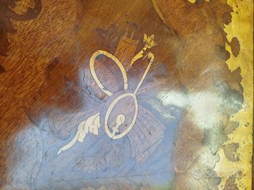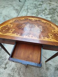 Elegante tavolino consolle a mezza luna, in legno pregiato con intarsi floreali e musicali.