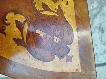 Il piano apribile si trasforma in tavolo rotondo con superficie interna rivestita, tipica dei tavolini da gioco o da scrittura.
