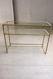 Elegante tavolino consolle con struttura in metallo color oro e doppio ripiano in vetro. Design minimal e moderno, perfetto per ingresso, soggiorno, dietro al divano o come mobile decorativo. La struttura è solida e stabile, mentre i ripiani in vetro danno un effetto leggero e raffinato. Ideale anche per: • ingresso / consolle • mobile decorativo • porta oggetti o libri • angolo bar o piante Condizioni buone, vetro integro. Misure circa: Larghezza 120 cm Profondità 40 cm Altezza 75 cm Ritiro a mano.