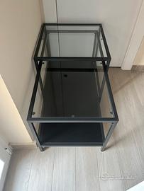 Vendo tavolino/console in ottime condizioni, struttura in metallo nero con doppio piano: uno in vetro trasparente e uno in pannello nero. Design moderno e minimal, ideale per soggiorno, ingresso o studio.
