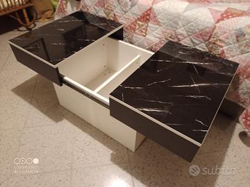 Vendo tavolino contenitore con finitura lucida effetto marmorizzato colore nero, con due ampi spazi di archiviazione all'interno ed un unico binario di scorrimento per aprire e chiudere contemporaneamente entrambi i lati.