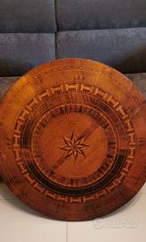 Antico tavolino sorrentino/rolino rotondo in legno intarsiato con motivo geometrico.Il piano circolare è caratterizzato da elaborati intarsi geometrici, realizzati con una combinazione di legni pregiati come noce, olivo ed ebano. Il tavolo è sostenuto da un gambone centrale TORNIO. Non conosco l'epoca esatta, ma auesto tipo di arredamento è tipico della seconda metà del XIX secolo. Misure: diametro 70 altezza 76. Nessun intarsio mancante, basta una semplice lucidatura per renderlo perfetto