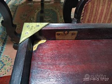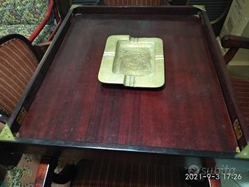 Tavolino d'epoca, con finiture in ottone, completo di 4 poltroncine rivestite,
