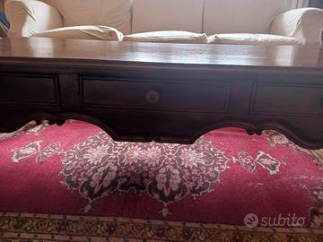 grande tavolino basso da appoggio, in noce, con 3 cassetti, ideale da inserire davanti a poltrone o divani