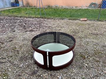 Tavolino da caffè rotondo vintage in legno con piano in vetro