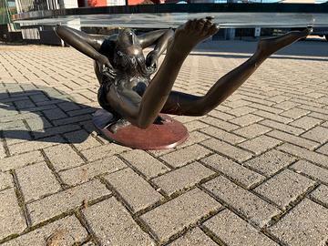 Il tavolo è composto da una base scultorea rifinita in bronzo scuro/nero che raffigura una silhouette femminile in posa plastica, sormontata da un elegante piano in vetro ovale di alto spessore.