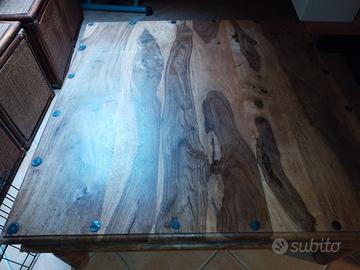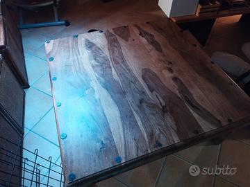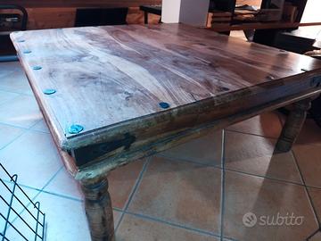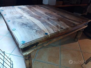 Tavolino da caffè etnico in teak con chiusure in ferro, India del Nord 1Mx1M 42h. Stile 1950 consumato sugli angoli.