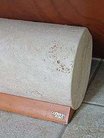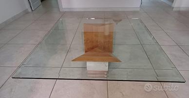 Tavolino Cattelan modello Valentino con piano in cristallo, base in ciliegio e travertino. Dimensioni 1x1 metro