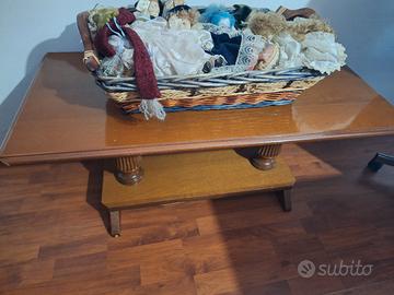 Vendo splendido tavolino da caffè in legno massiccio, caratterizzato da un design solido e senza tempo. Perfetto per arredare soggiorni in stile classico, rustico o country chic. Dettagli del mobile: Stile: Classico / Fratino con gambe tornite e scanalate. Materiale: Legno con finitura color noce caldo. Struttura: Molto robusta, con doppia colonna centrale e pedana di base che garantisce massima stabilità. Condizioni: Buone condizioni generali, con una naturale patina che ne esalta il carattere vintage (piccoli segni di usura come da foto, facilmente ripristinabili con un tocco di cera). Il tavolo è ideale come punto focale davanti al divano o come piano d'appoggio decorativo per ceste, libri o lampade.