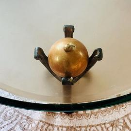 La base scultorea in stile modernista presenta sfere decorative finitura ottone abbinate a struttura in metallo nero, creando un forte impatto architettonico. Perfetto per chi ama il design moderno con un tocco mid-century.