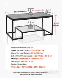 • Venditori Affidabili di Esperienza • Spediamo ovunque, anche in Contrassegno • Vendiamo solo articoli Nuovi di prima qualità • Contattaci per qualsiasi info necessaria Design a due livelli: l'ampio piano del tavolo offre ampio spazio per libri, bicchieri d'acqua, computer portatili e snack. Inoltre, il tavolino da caffè presenta un ripiano nella parte inferiore per riporre piccoli oggetti di uso quotidiano Illuminazione personalizzata: il piano in vetro temperato. La struttura in metallo conferisce al tavolo un moderno look industriale, mentre le strisce LED multicolori consentono di creare diverse atmosfere luminose Supporto stabile: il tavolino in vetro con struttura rettangolare in metallo supporta fino a 45,3 kg. La finitura in smalto cotto protegge da corrosione e ruggine; i piedini regolabili compensano le irregolarità del pavimento Facile da montare e pulire: grazie alle istruzioni chiare, il tavolo è facile da montare. Il piano in vetro temperato è impermeabile e quindi particolarmente resistente. Le macchie sul tavolo possono essere facilmente rimosse Utilizzo versatile: il nostro tavolino è ideale per camere da letto, camere degli ospiti, uffici. Nota: i colori possono variare leggermente dalle immagini a causa delle condizioni di illuminazione e delle impostazioni dello schermo