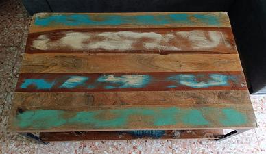 Tavolino da caffè in legno di recupero e ferro. (Legno massello di recupero: Il legno massello di recupero è costituito da legni riutilizzati quali il teak, il legno di mango, il legno di pino e il faggio. Questi materiali sono riciclati da vecchi immobili come fabbriche, capannoni e barche. Poiché che ogni pezzo è lavorato a mano, i colori variano per ogni articolo.)