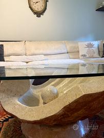 Base in pietra Mactan scolpita a forma di conchiglia con piano in vetro. Pezzo vintage di grande impatto estetico, perfetto per ambienti moderni o arredamenti di design.