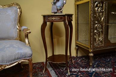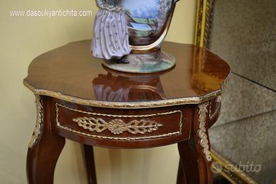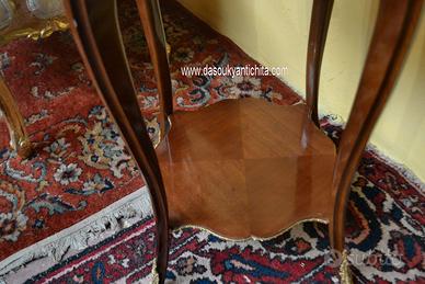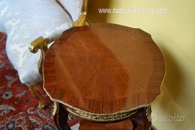 Bellissimo tavolino tondo in stile Luigi XV con doppio ripiano in noce e radica lastronato in bois de rose a spina di pesce, rifinito da applicazioni in bronzo cesellato e dorato.