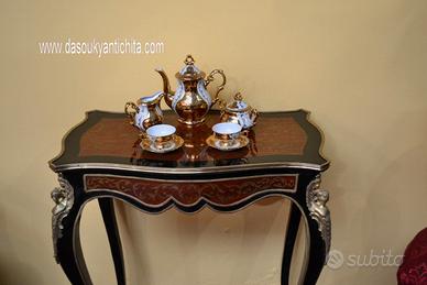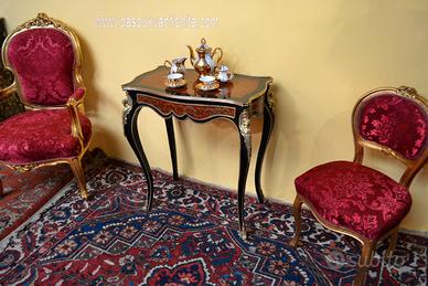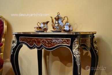 Particolare tavolino da centro stile Napoleone III, in legno ebanizzato dipinto in policromia a motivi floreali di gusto Boulle, arricchito da cariatidi femminili e scarpette in bronzo cesellato e dorato