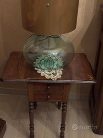 Tavolino anni ’20-’30 in condizioni eccellenti, in noce massello e radica di noce con due ribalte laterali, cassetti davanti e dietro, pomelli in ottone e gambe tornite con intagli e ruote d’epoca.