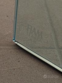 Materiale: È realizzata in un unico foglio di vetro trasparente temperato, curvato per creare sia il piano superiore che le gambe di supporto, senza giunture visibili.